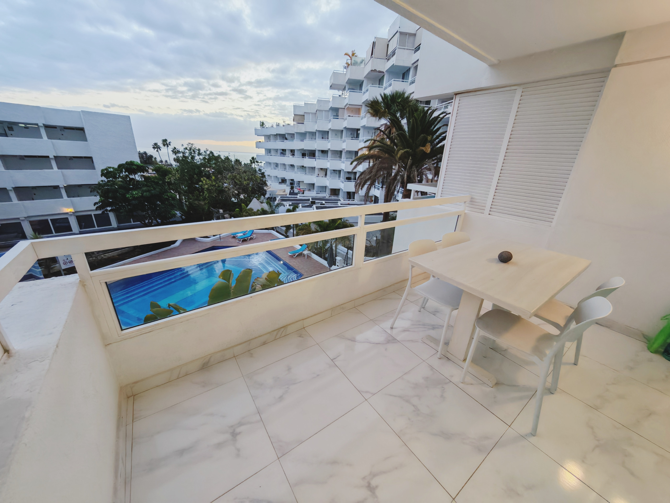 Welcome to the Skyline by the Sea vacation rental. Just 200 meters from Tenerife's most beautiful beaches, this stylish apartment offers breathtaking sea views—a place to arrive, relax, and feel at home. The spacious vacation apartment has two cozy bedrooms, one of which is equipped with a comfortable king-size bed and the other with two single beds. The bright living area invites you to linger and also offers a separate dining area – ideal for shared meals or convivial evenings. The fully equipped kitchen offers everything you need for a carefree stay. The apartment also has a large shower room and an additional guest toilet. The absolute highlight is the terrace with sensational sea views – enjoy your morning cup of coffee or the sunset over the Atlantic here. The apartment is located in a well-maintained, quiet complex. The spacious communal pool offers a welcome refreshment on warm days, whether you want to relax and splash around or swim laps. In the immediate vicinity, you will find numerous restaurants, cozy cafés, shopping facilities, and, of course, the sea – all within easy walking distance. A perfect place for an unforgettable vacation in Tenerife.