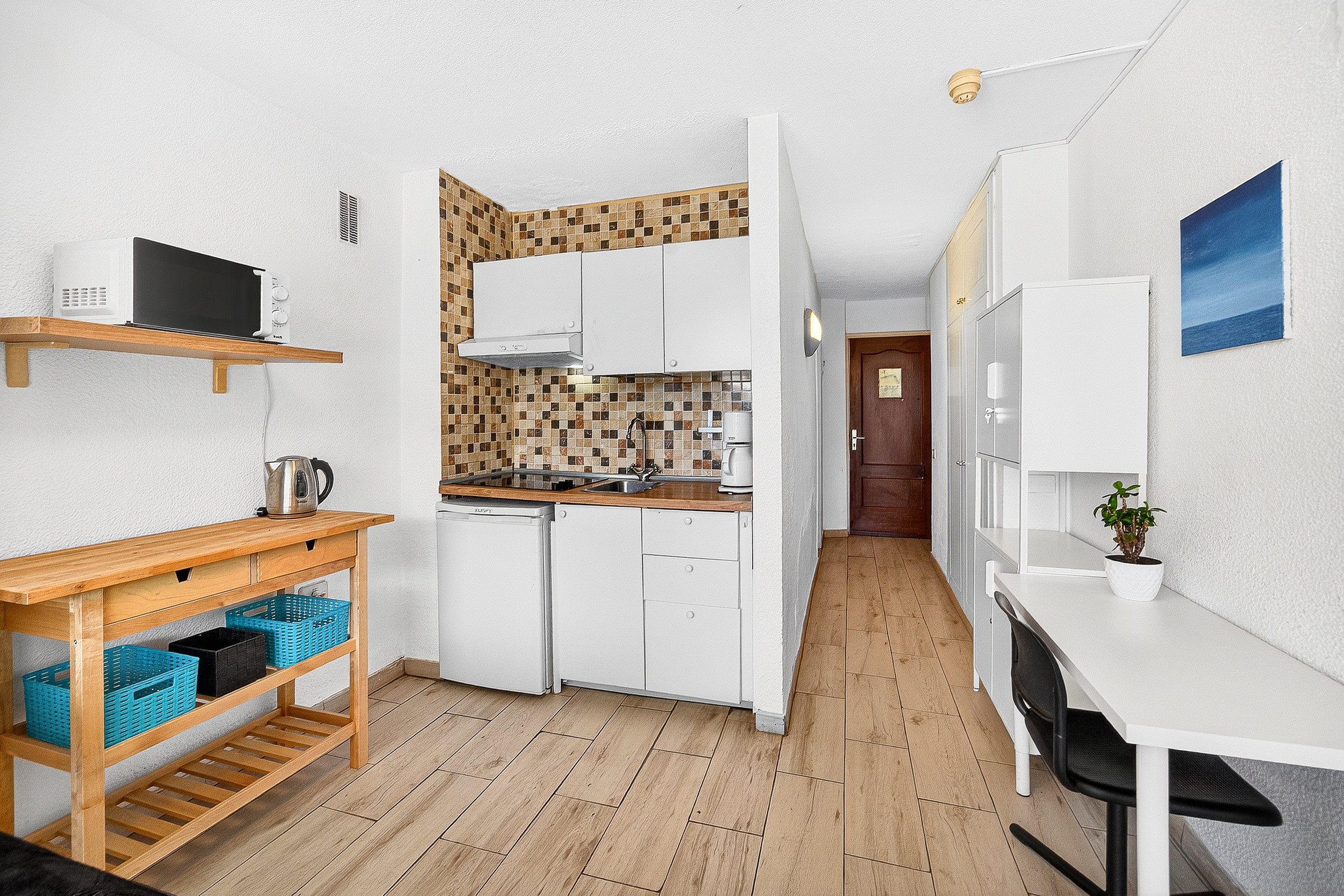 Disfrute de sus vacaciones en este luminoso estudio con impresionantes vistas al mar directamente desde la terraza privada. El complejo Ponderosa destaca por su ubicación privilegiada en el corazón de Playa de las Américas, a solo unos minutos a pie de las mejores playas, restaurantes y tiendas. El estudio cuenta con una zona de estar y dormitorio diáfana y luminosa con una cómoda cama doble, amplio espacio de almacenamiento y una cocina bien equipada. El cuarto de baño está equipado con ducha y WC. Lo más destacado es la terraza privada con vistas directas al Atlántico, perfecta para tomar un café por la mañana o una copa de vino por la noche.